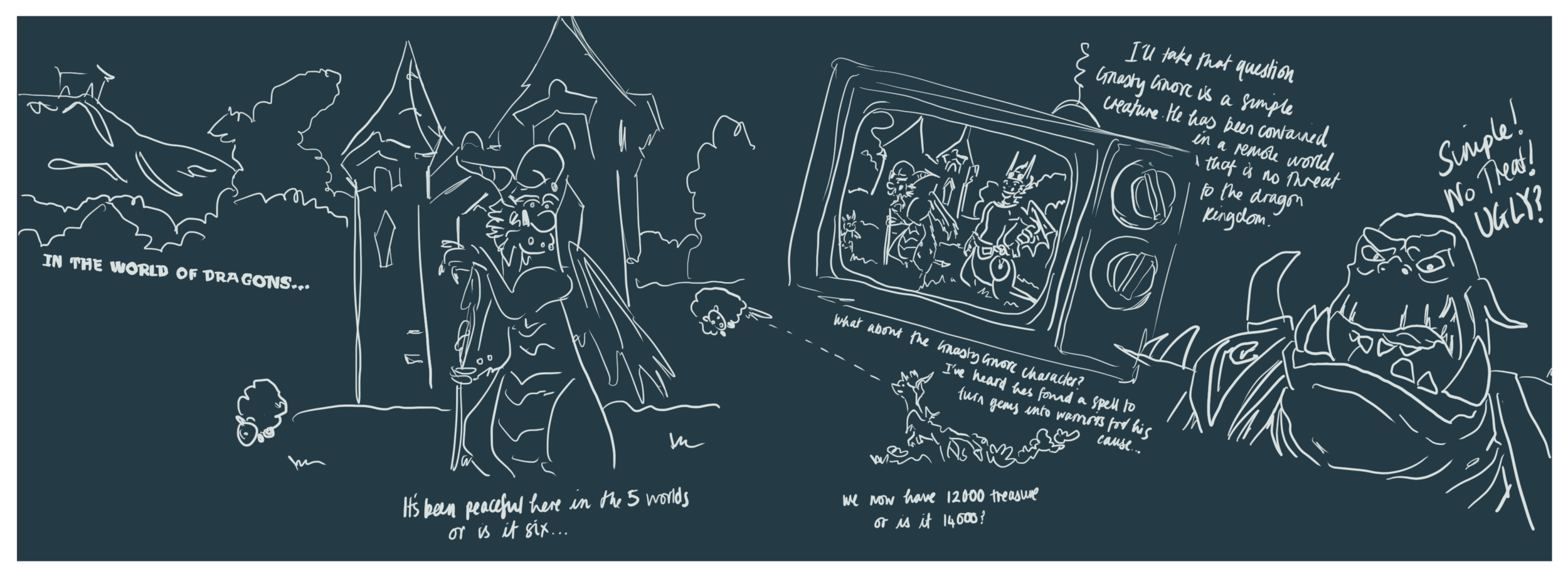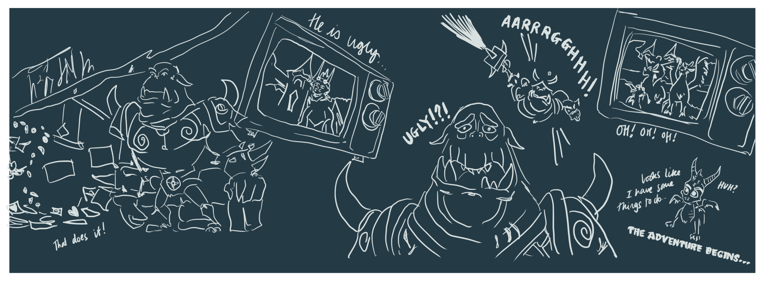 Below I did a quick storyboard of the cutscene from the beginning of Spyro with some brief annotations on the audio dialogue.