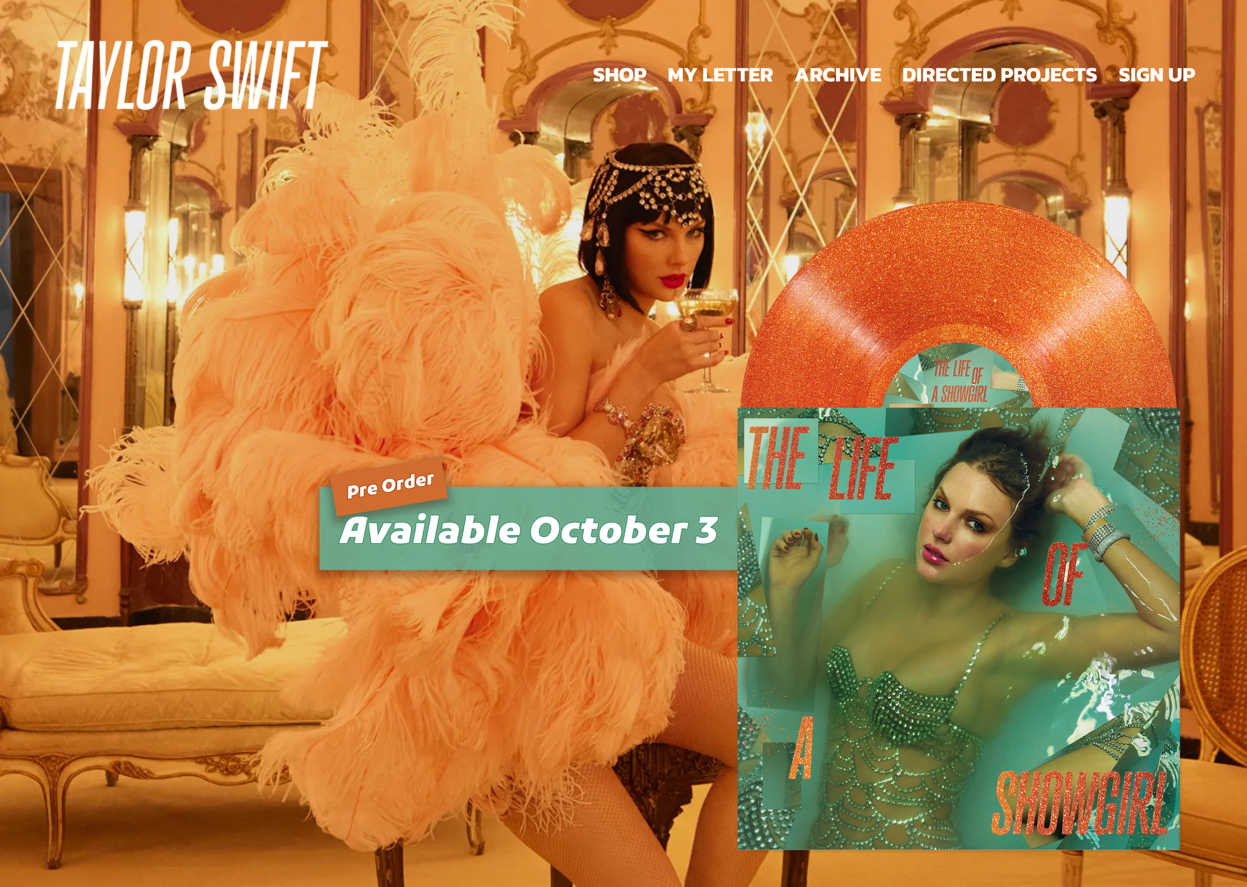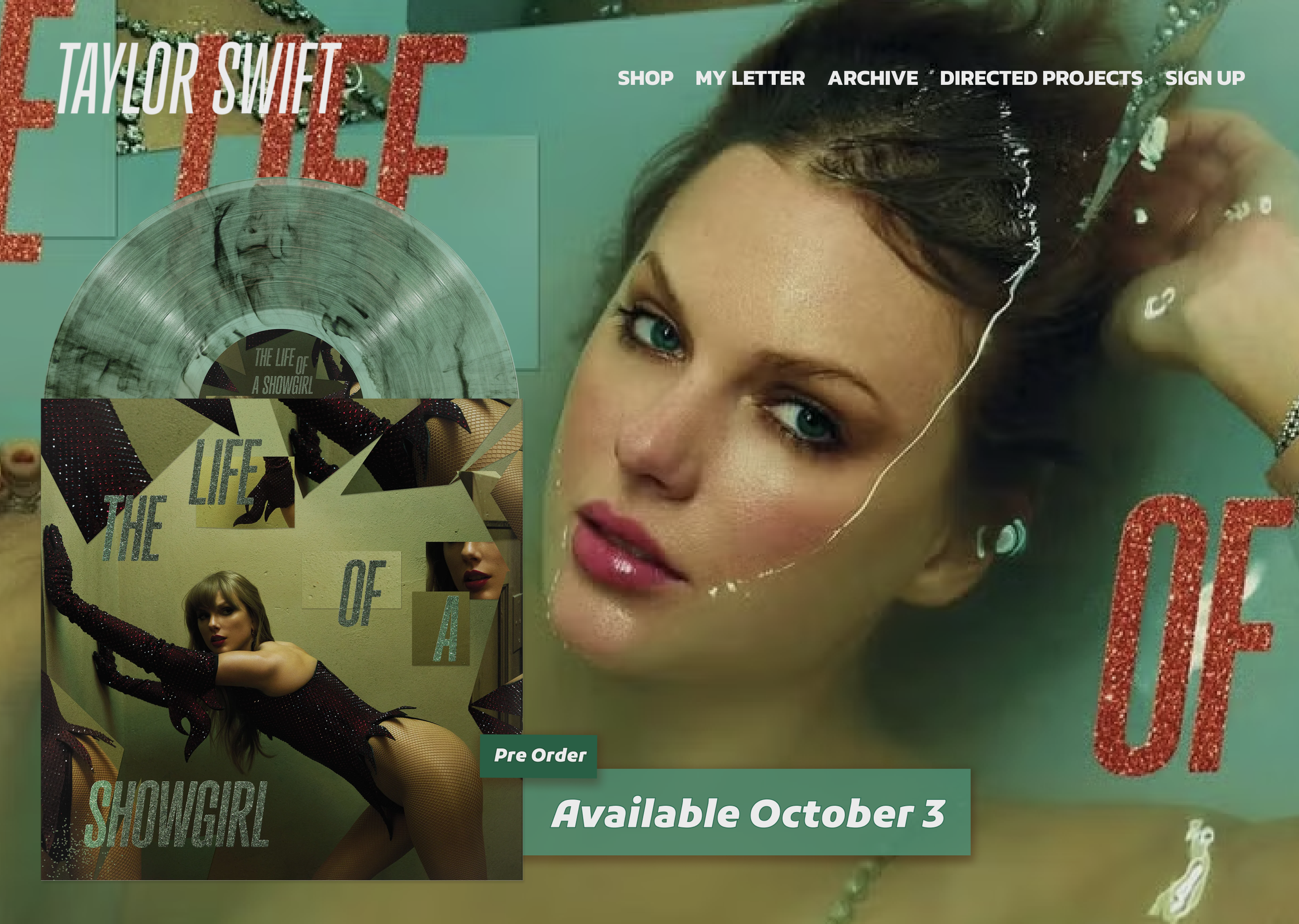 Design a full image landing page for Taylor Swifts new album Life Off A Showgirl pre order.