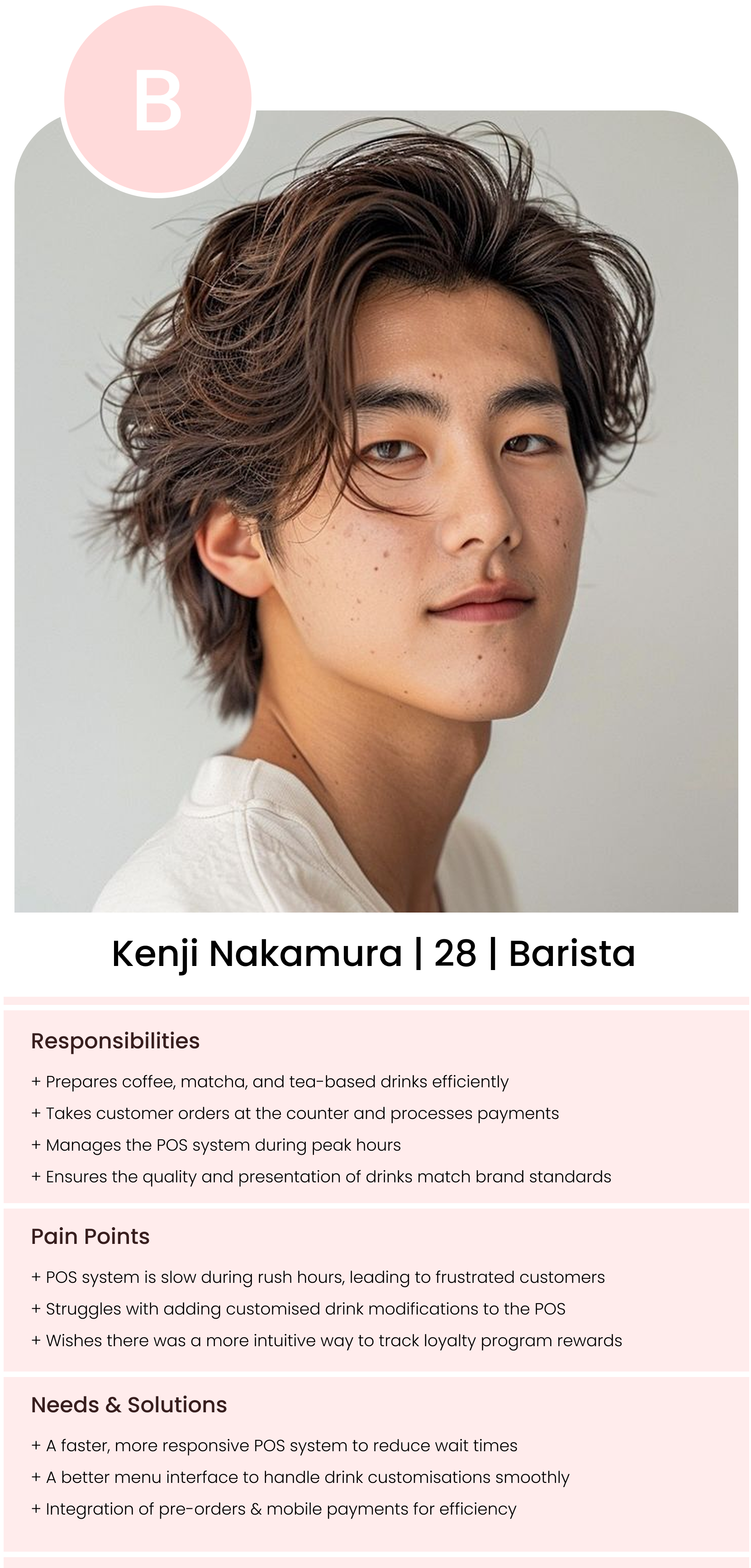Based on our research, we developed three primary personas: Kenji, The Barista - Her goals are to be able to process orders quickly during busy periods, reduce inventory errors and manage spit payments and discounts. She gets frustrated at the time spent repeating training on an old complex system.