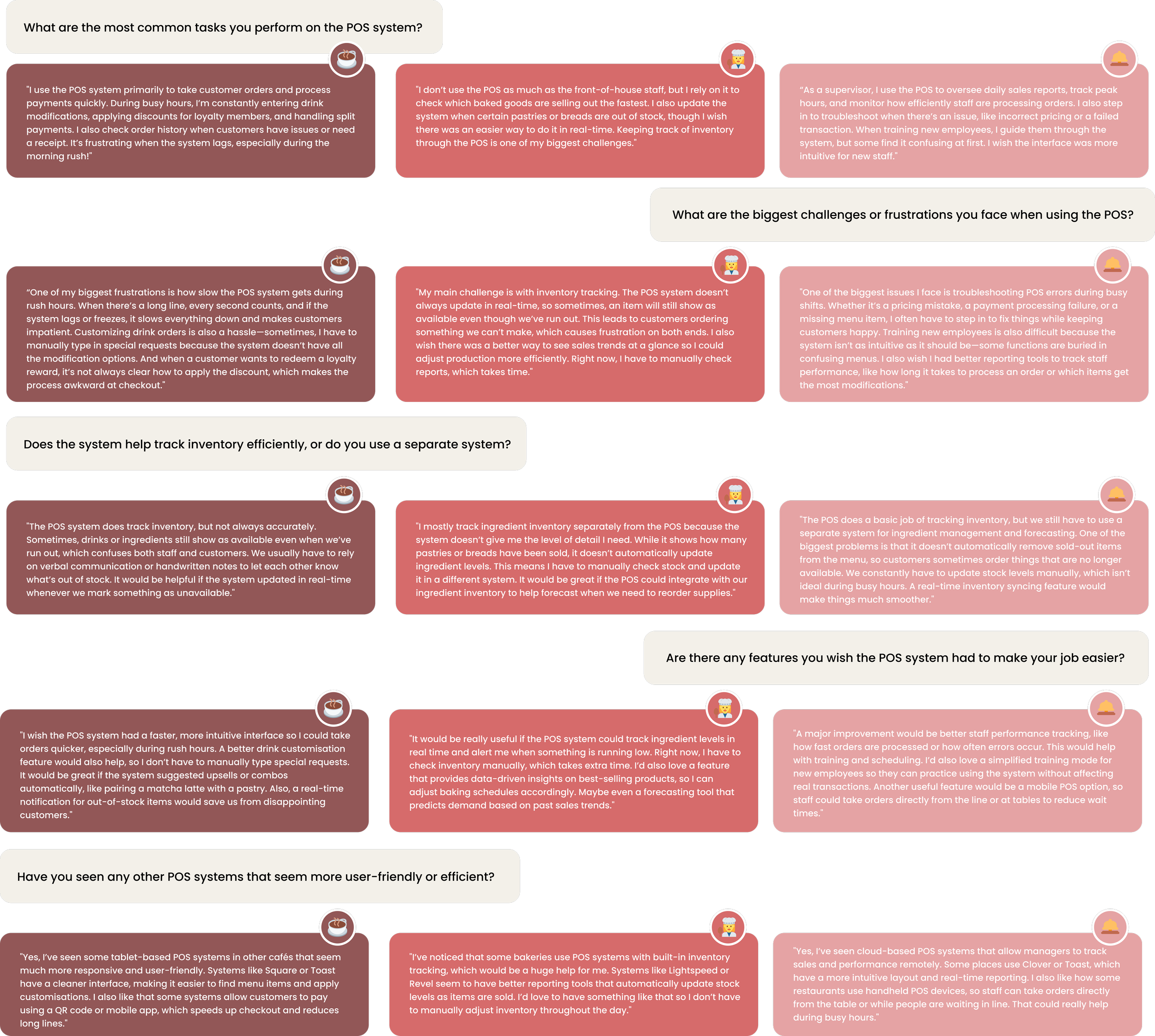 We conducted on-site observations and interviewed 15 staff members, including cashiers, kitchen staff, and managers. Key insights included: