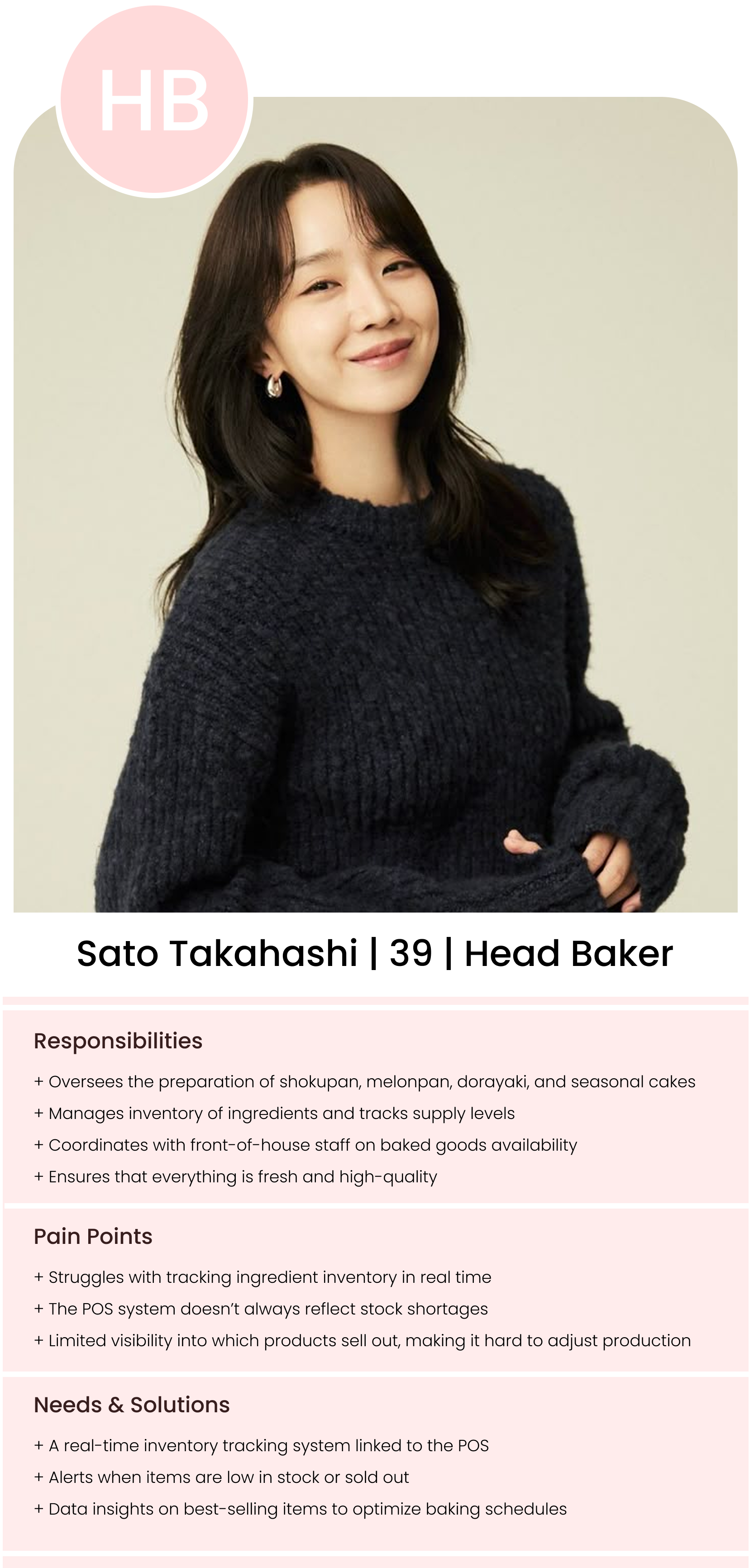 Sato, Head Baker - Needs to be able to monitor inventory levels in real time to reduce waste and prevent stock running out. She needs access to sales data to predict popular items. Currently she lacks immediate feedback on what’s selling and struggled with manual inventory updates.
